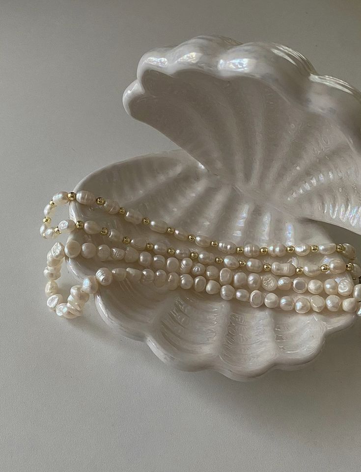 Tiga baris kalung mutiara tampak tertata anggun dalam wadah kerang berkilau. Mutiara-mutiara berwarna putih gading dengan bentuk yang tidak sepenuhnya seragam menunjukkan keasliannya bukan hasil produksi massal, melainkan hasil alam yang unik dan otentik. Setiap butirnya menyimpan karakter, seperti halnya setiap individu yang mengenakannya.